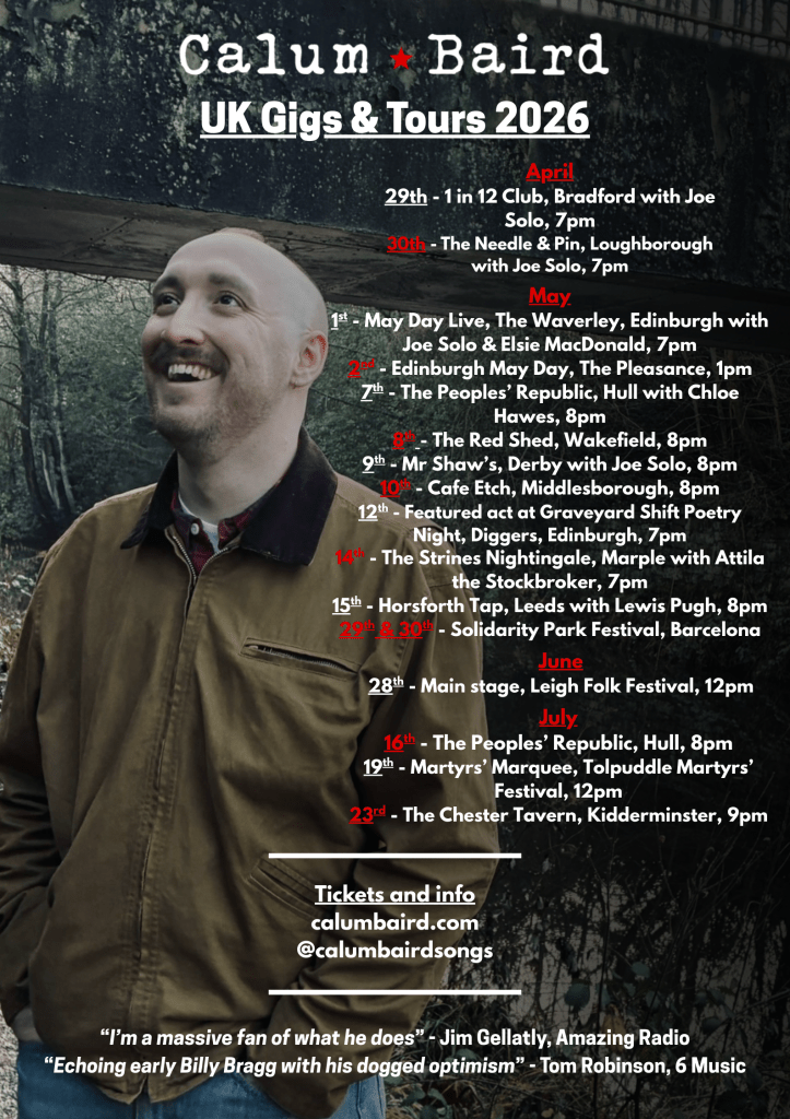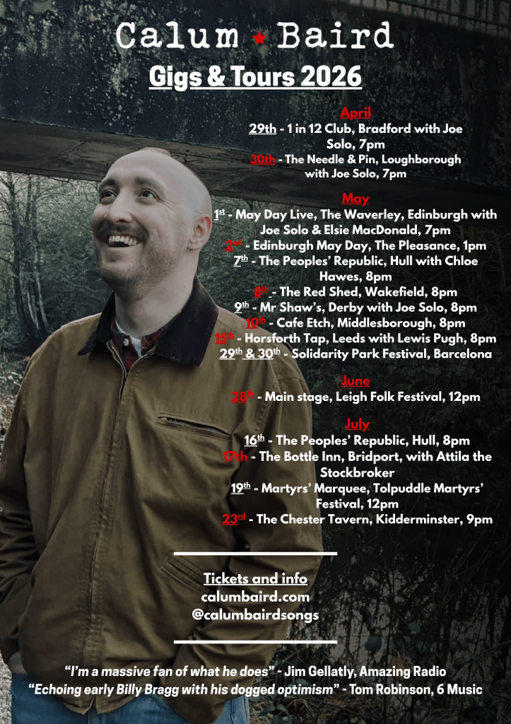 Calum’s music is characterised by its honesty and authenticity, with lyrics that are often introspective and personal. His songs explore social commentary, modern life, relationships, alienation and social change. Calum’s influences include Bob Dylan, The Pogues, Johnny Marr, Billy Bragg and Dick Gaughan.